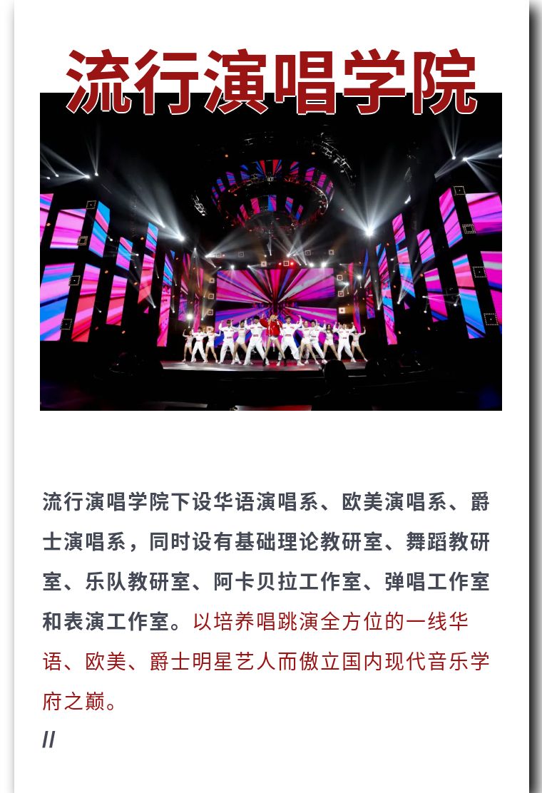 目前,学院拥有6大个专业学科50个专业培养方向、600余名教职员工、5000余名在校学生。近10年来,我院学生在《快乐女声》《快乐男声》《中国好声音》《中国好歌曲》《中国好舞蹈》《中国有嘻哈》《创造101》《偶像练习生》《青春有你》《这!就是街舞》《这!就是原创》《中国新说唱》《乐队的夏天》等大型选秀活动中,摘金夺银,取得了骄人的业绩。