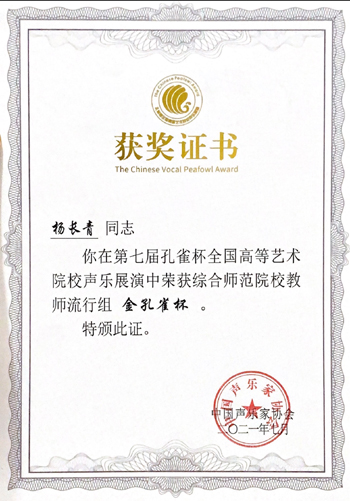 杨长青老师表示:“此次幸不辱命,在第七届“孔雀杯”高等艺术院校声乐展演总展演中拿下了金奖!非常感谢学院给予的宝贵机会,感谢流行演唱学院李铁军院长和华语演唱系主任衣江风老师的支持和鼓励,希望越来越多像我这样年轻老师能有机会参加更多的比赛,充实自我,提高自我,反馈教学,用更好的教学成果回馈学校!”